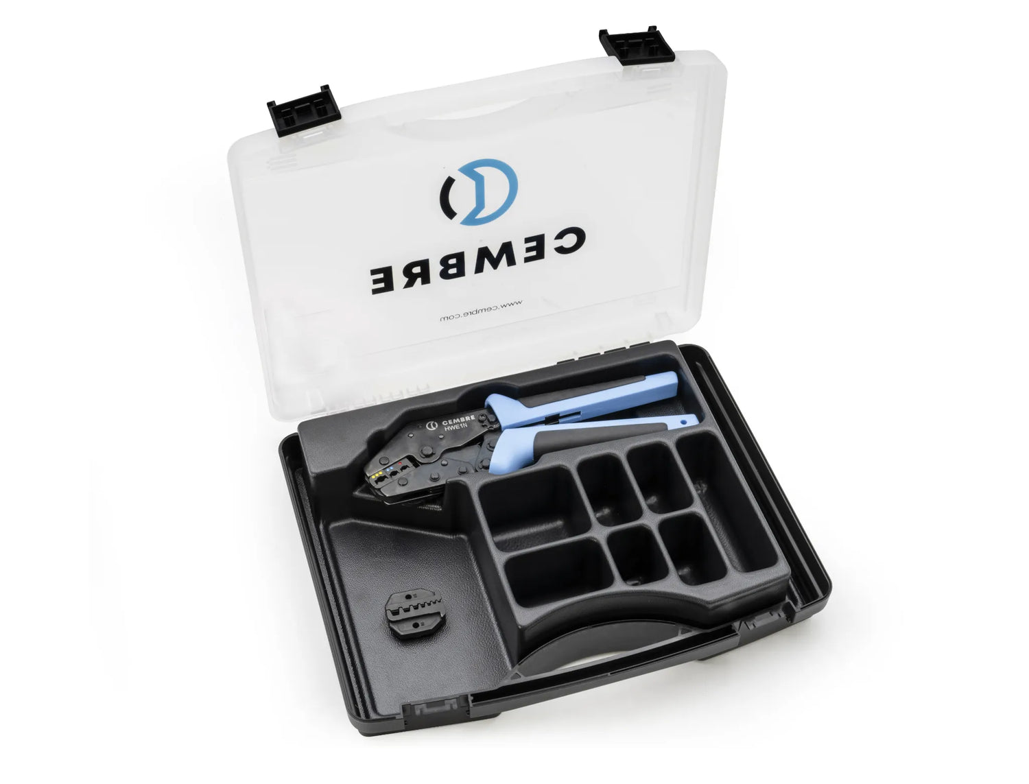 De set bestaat uit de perstang en een selectie van verschillende soorten connectoren voor een breed scala aan verbindingen.